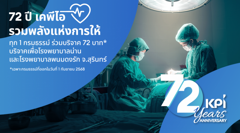 เคพีไอ ครบ 72 ปี เดินหน้าสู่สังคมแห่งการแบ่งปัน ผ่านโครงการ “72 ปี เคพีไอ รวมพลังแห่งการให้” ชวนลูกค้าร่วมบุญบริจาคช่วยเหลือรพ.น่าน และรพ.พนมดงรักฯ