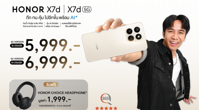 22 ตุลาคม 2568, กรุงเทพฯ – ออเนอร์ (HONOR) เดินหน้าตอกย้ำจุดยืนสมาร์ตโฟน “ถึก ทน คุ้ม ไปอีกขั้น พร้อม AI” เปิดตัว HONOR X7d Series อย่างเป็นทางการในประเทศไทย มาพร้อมสองรุ่นให้เลือก ได้แก่ HONOR X7d 4G (8+256GB) และ HONOR X7d 5G (8+256GB) โดดเด่นด้วยดีไซน์แข็งแกร่งระดับพรีเมียม มาตรฐาน IP65 กันน้ำกันฝุ่น และการรับรองความทนทานระดับ 5 ดาวจาก SGS ที่สามารถทนต่อแรงตกกระแทกจากความสูงถึง 2 เมตร เสริมด้วยฟีเจอร์ AI อัจฉริยะครบชุด ทั้ง AI Button สำหรับเรียกใช้งานคำสั่งสำคัญอย่างรวดเร็ว และ AI Eraser ที่ลบสิ่งรบกวนในภาพได้แนบเนียนราวมือโปร พร้อมแบตเตอรี่คู่ความจุเต็มพิกัด 6,500mAh ใช้งานได้ยาวนานตลอดวัน ครบทั้งความถึกและความฉลาดในเครื่องเดียว เปิดราคาสุดคุ้มเริ่มต้นเพียง 5,999 บาท พร้อมวางจำหน่าย 23 ตุลาคมนี้ทั่วประเทศ