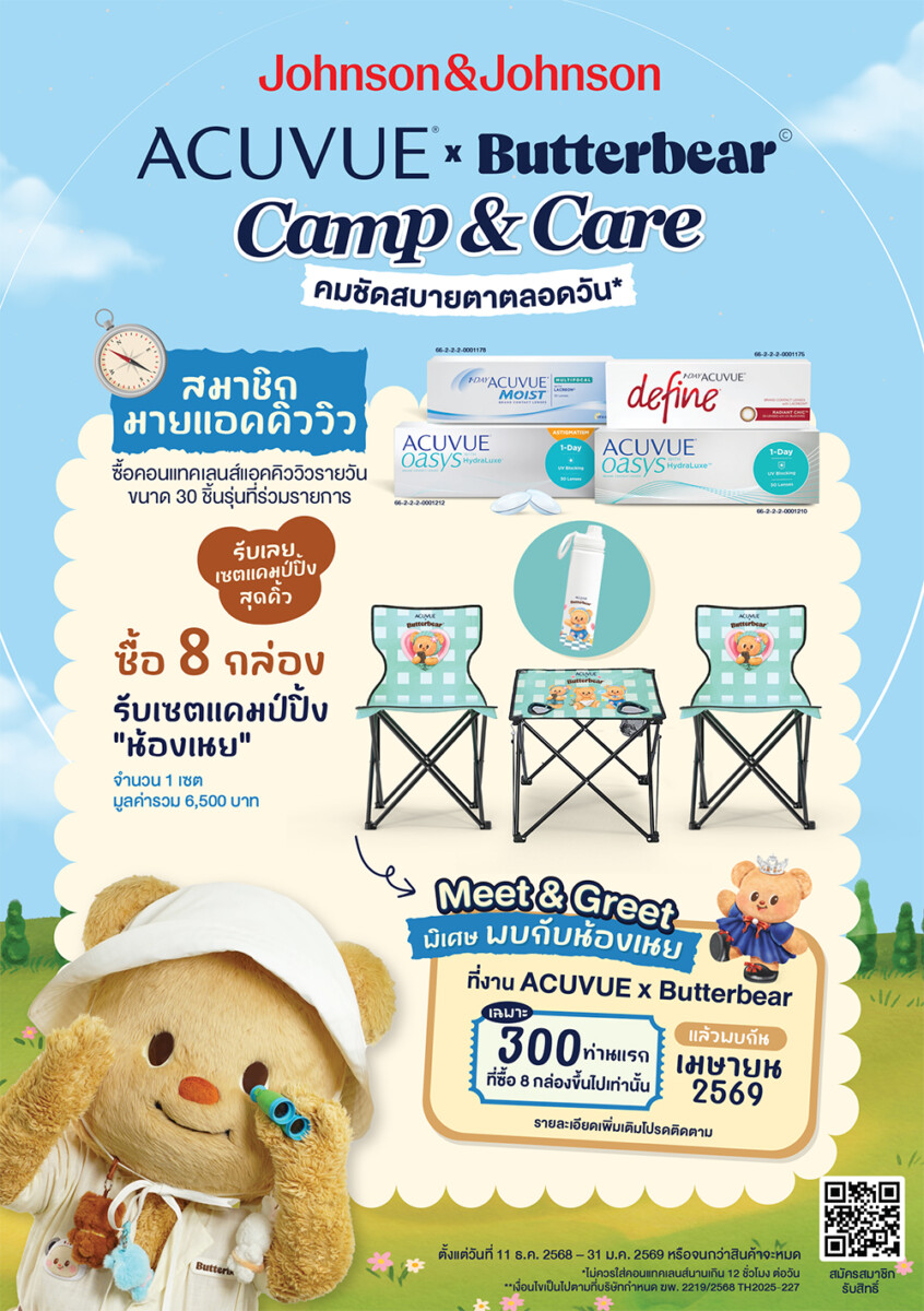 กรุงเทพฯ 23 ธันวาคม 2568 – ACUVUE (แอคคิววิว) แบรนด์คอนแทคเลนส์จาก จอห์นสัน แอนด์ จอห์นสัน เมดเทค จัดแคมเปญใหญ่ส่งท้ายปี ACUVUE x Butterbear Camp & Care ชวนดูแลสุขภาพสายตา เพื่อการใช้ชีวิตทำกิจกรรมในทุกช่วงเวลาได้อย่างสะดวก และมั่นใจ พร้อมมอบประสบการณ์ความสุข